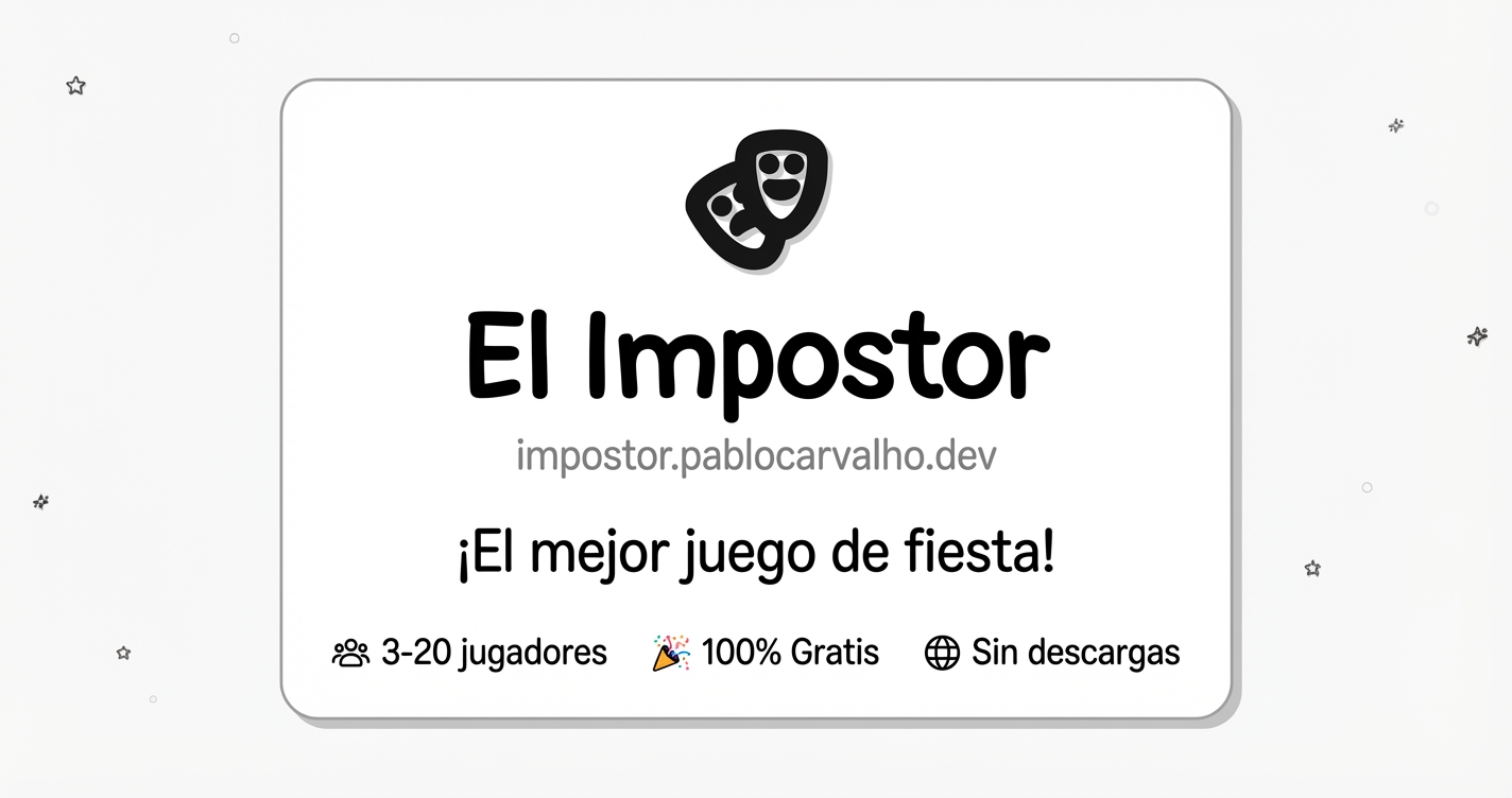 El Impostor es el juego del verano 2026. El mejor juego de fiesta gratis online. Juega con tus amigos y familia a encontrar al impostor. Un jugador es el impostor y debe descubrir la palabra secreta sin ser descubierto. Perfecto para reuniones, fiestas de cumpleaños, y momentos con amigos. Similar a Among Us pero con palabras. Disponible gratis, sin descargas, directamente en tu navegador. Juego de deducción social para grupos de 3 a 20 jugadores. El juego del verano 2026 es perfecto para jugar en grupo, ideal para fiestas y reuniones familiares. Descubre quién es el impostor mientras intentas adivinar la palabra secreta. Juego de palabras interactivo y divertido.